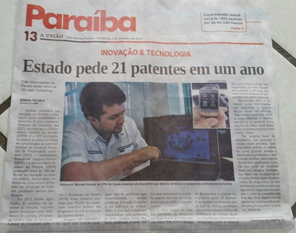 [...] O outro foi sobre o carro inteligente, sistema de diagnóstico de problemas automotivos, criado pelo professor do Campus Sousa, Maxwell Anderson Ielpo Amaral. É um aplicativo que faz o diagnóstico de problemas mecânicos dos automóveis e que pode ser acoplado a qualquer veículo. O sistema transmite as informações não só para o motorista no painel do carro, mas manda diretamente para o fabricante que já pode acionar as mecânicas autorizadas. [...]